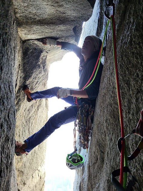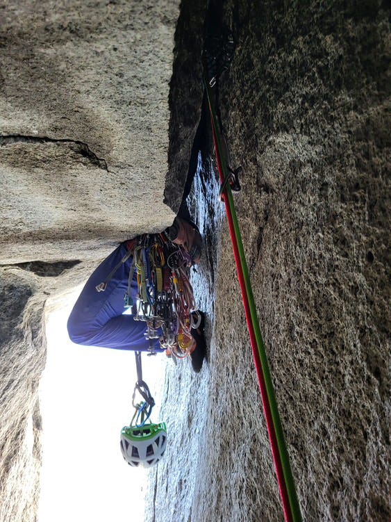 I led as fast as I could. I climbed boldly and confidently, moving quickly before my brain could feel the fear and placing gear only where necessary so as not to waste any precious minutes. My breaths quickly became short and shallow, my shirt drenched in sweat, and I had the biggest thirst on the entire mountain. To make matters worse, I was now standing at the base of the Narrows—a dark vertical chimney just wide enough to squeeze through, but tight enough to incite a panic attack. Imagine those videos where cavers have their cheeks pressed to the ground are trying to wiggle their way through… now take that cave and place it vertically near the top of a 1500-foot-tall formation. This is the Narrows.